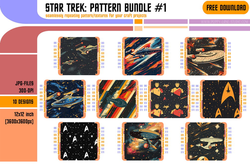 An exciting mix of Star Trek themed pattern designs in retro colours on black background. All 10 patterns offer a seamless repeat and can be used in the craft projects of your choice.