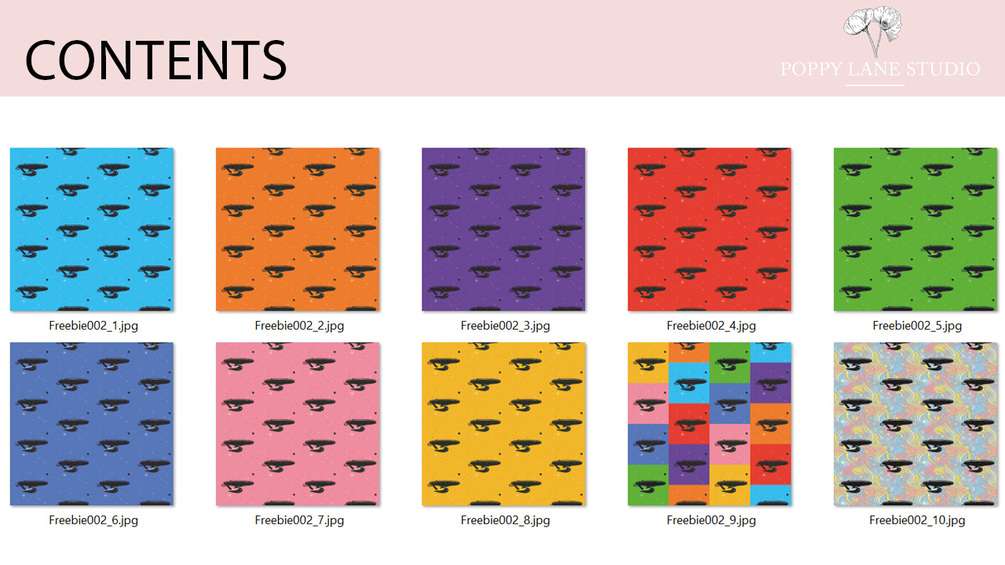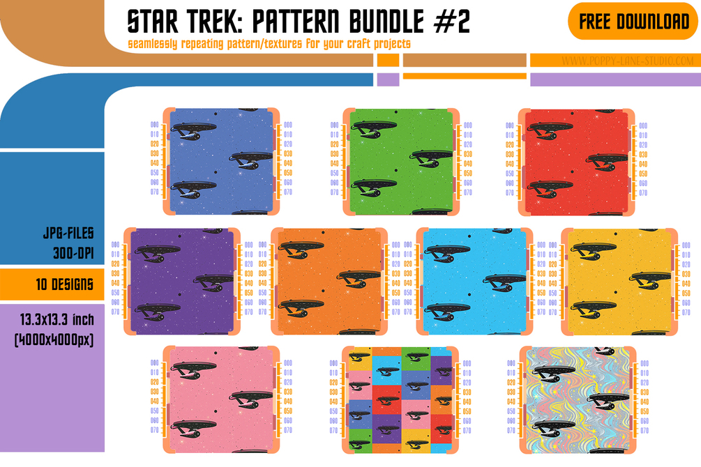 An simple yet fun colour mix of Star Trek themed digital papers featuring the original (Captain Kirk’s; TOS) Enterprise NCC-1701. All 10 colour variations offer a seamless repeat.